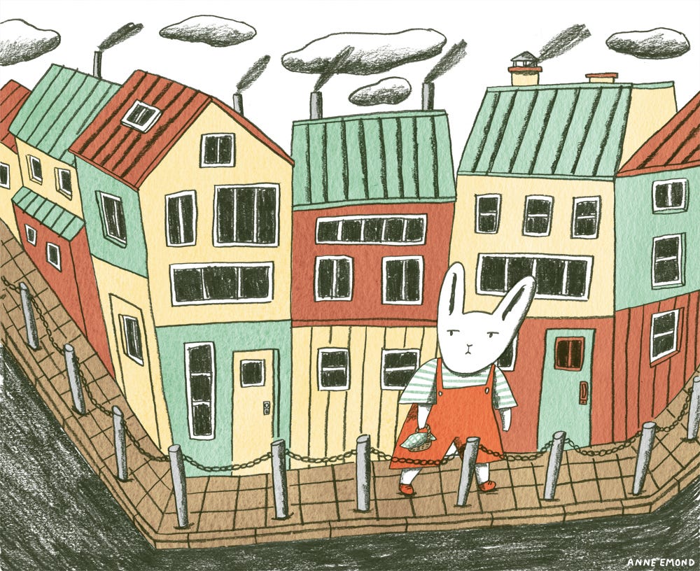 As I started sketching this drawing I wanted to include a character following Walter from around the corner, more irritating than sinister, but couldn’t decide what it might be. I sketched a bird, a frog, a fox, another (bespectacled) rabbit, but nothing felt quite right. Since I was running out of time I went ahead with the drawing anyway, sans pursuer. I am continuing to think on it though; as I develop a little story about Walter I’d like another character as a foil, but who or what that character will be remains undecided.