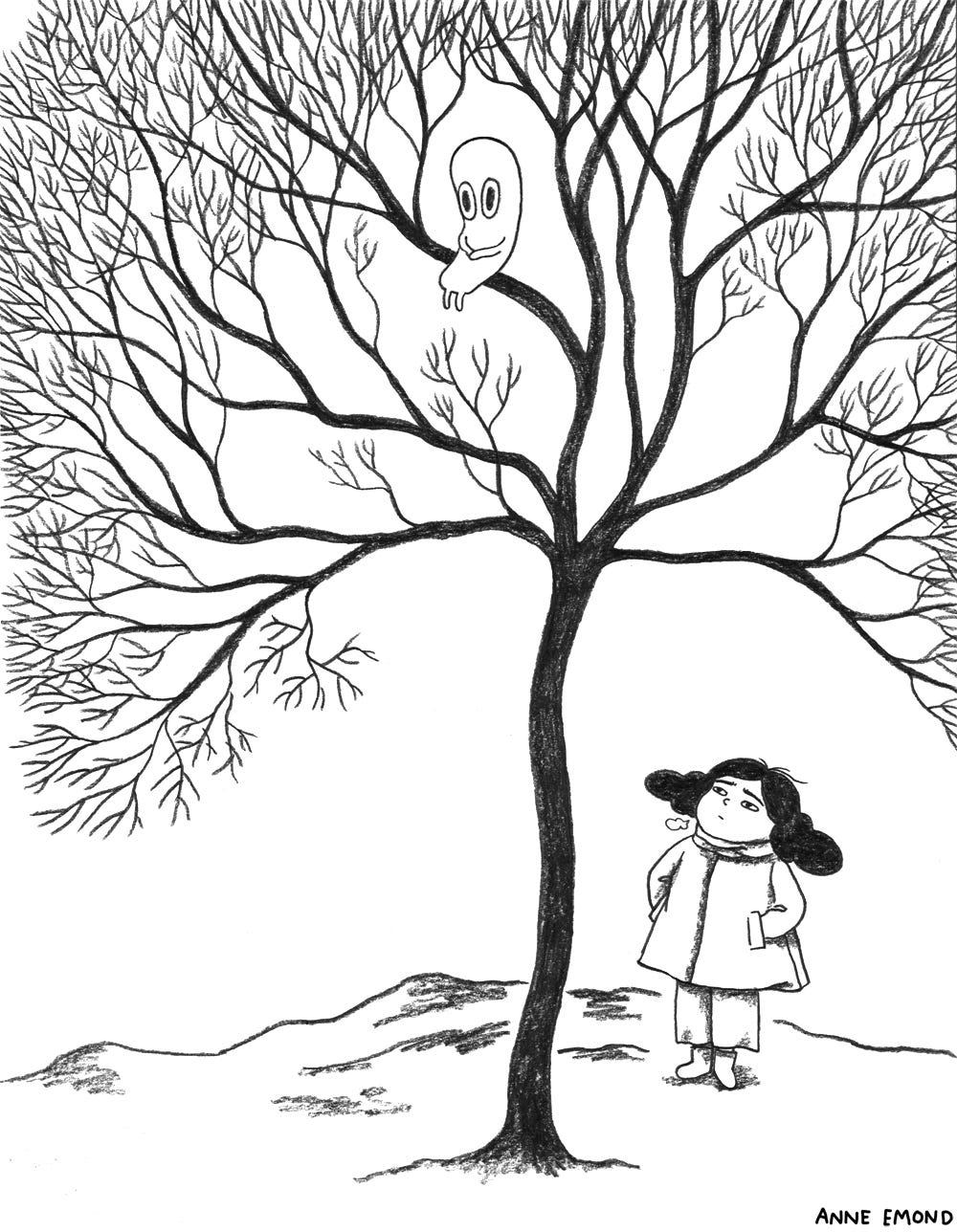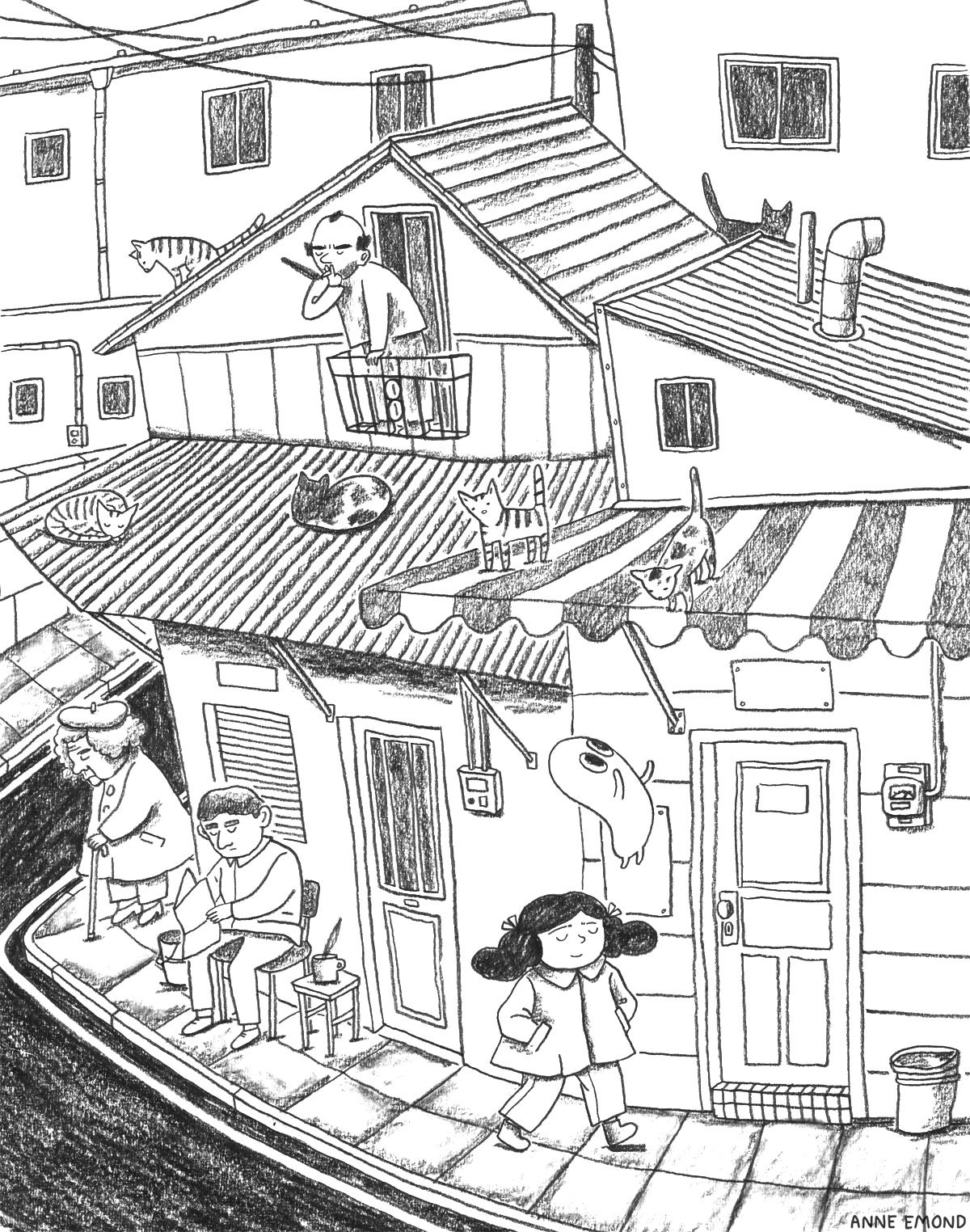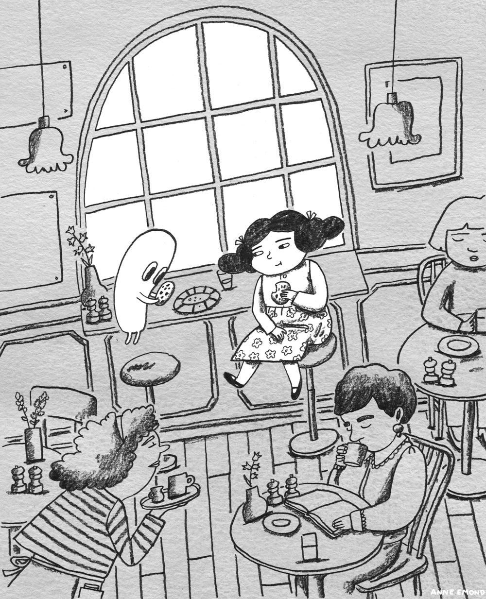 Just a roundup of a few drawings I posted in Notes over the past week or so. Still having fun drawing Lulu and this little guy (don’t really want to give it a name so am just calling it “little guy” for the time being). These drawings are all basically a revisit of things I love to draw, namely: cafes, city street scenes, trees.
