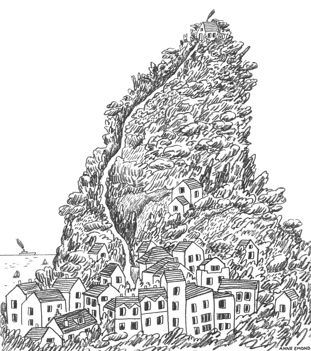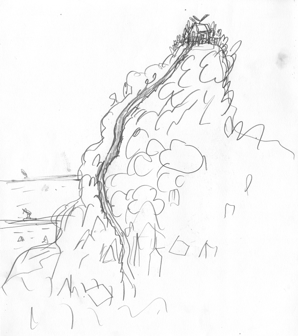 I follow a similar process each time I do one of these quick-ish little pictures: I come up with an idea and do some sketches until I am satisfied. I keep my sketches very simple so that there will still be some spontaneity in the final drawing, here is the final (grubby) sketch for the drawing of the hilltop: